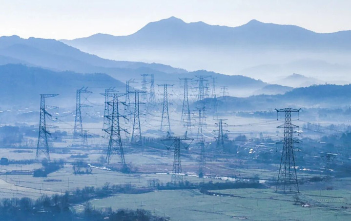 安徽省芜湖市繁昌区孙村镇,“西电东送”特高压通道工程与晨雾、山峦、乡村等相映成景。鲁君元摄(影像中国)