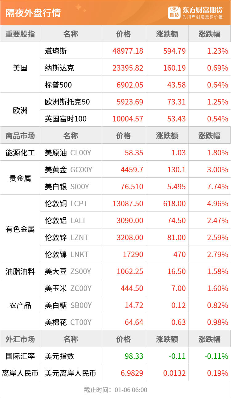 黄金:从周生生柜面及官方旗舰店核实,由于国际金价持续走强,品牌将于1月6日起对部分定价类黄金饰品进行调价,涨幅范围在200元至1500元之间。据了解,此次调价产品主要包括转运珠、定价联名款(如HelloKitty系列)以及金镶钻类饰品。(财联社)