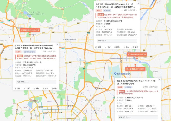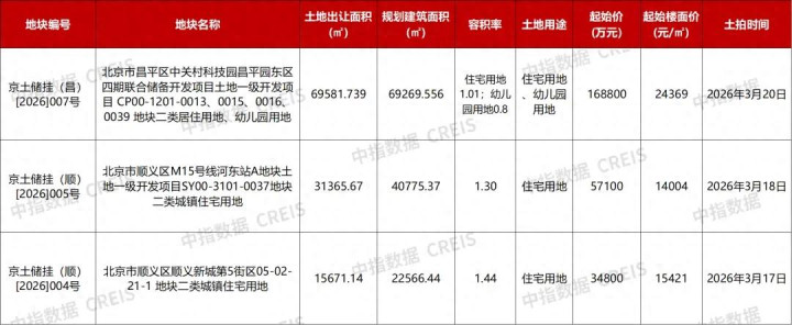 截至目前,3月份北京有3宗涉宅用地待拍,其中昌平区1宗、顺义区2宗,总土地出让面积11.66万㎡,总规划建筑面积13.26万㎡,总起始价达26.07亿元。顺义区2宗挂牌竞价截止时间分别为3月17日15:00和3月18日15:00,昌平区地块挂牌竞价截止时间为3月20日15:00。