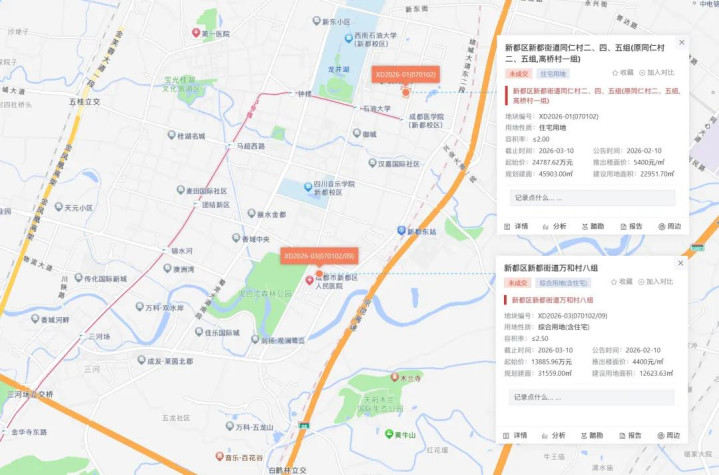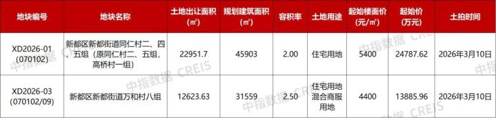 截至目前,成都已公告了2宗涉宅用地将于3月份出让,2宗地块均位于新都区新都街道,总土地出让面积3.56万㎡,总规划建筑面积7.75万㎡,总起始价3.88亿元,拍卖时间均为3月10日。