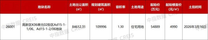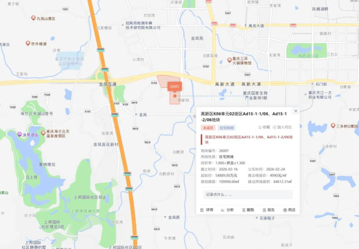 截至目前,重庆已公告了1宗高新区涉宅用地将于3月16日拍卖。高新区K06单元02街区Ad15-1-1/06、Ad15-1-2/06地块,地块编号26001,土地出让面积84612.31㎡,规划建筑面积109996㎡,起始总价5.49亿元,起始楼面价4990元/㎡。