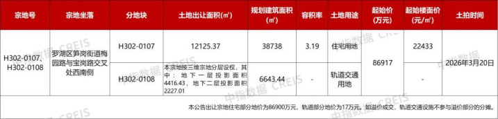 截至目前,深圳3月份已公告一宗罗湖区笋岗街道涉宅用地将于下旬出让,其中住宅用地出让面积12125.37㎡,住宅规划建筑面积38738㎡,住宅部分地价为86900万元,轨道部分地价为17万元(如溢价成交,轨道交通设施不参与溢价部分的分摊)。